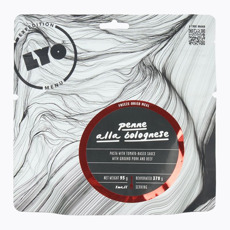 LYOFOOD Penne à la bolognese 95 g je lyofilizované jídlo, které obsahuje hustou omáčku s okouzlující chutí a vůní. Tato omáčka se připravuje z rajčat, mrkve a cibule, které se dusí na malém ohni spolu s mletým hovězím a vepřovým masem.
