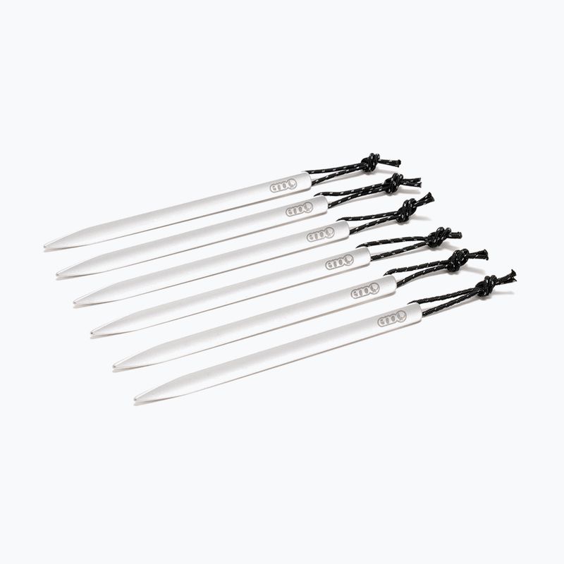 Hřebíky ENO Tarp Stake 6 ks jsou lehké a odolné prvky pro upevnění tarpu nebo stanu. Hliníková konstrukce dobře drží na povrchu a odrazové šňůry usnadňují jejich nalezení a používání za tmy.